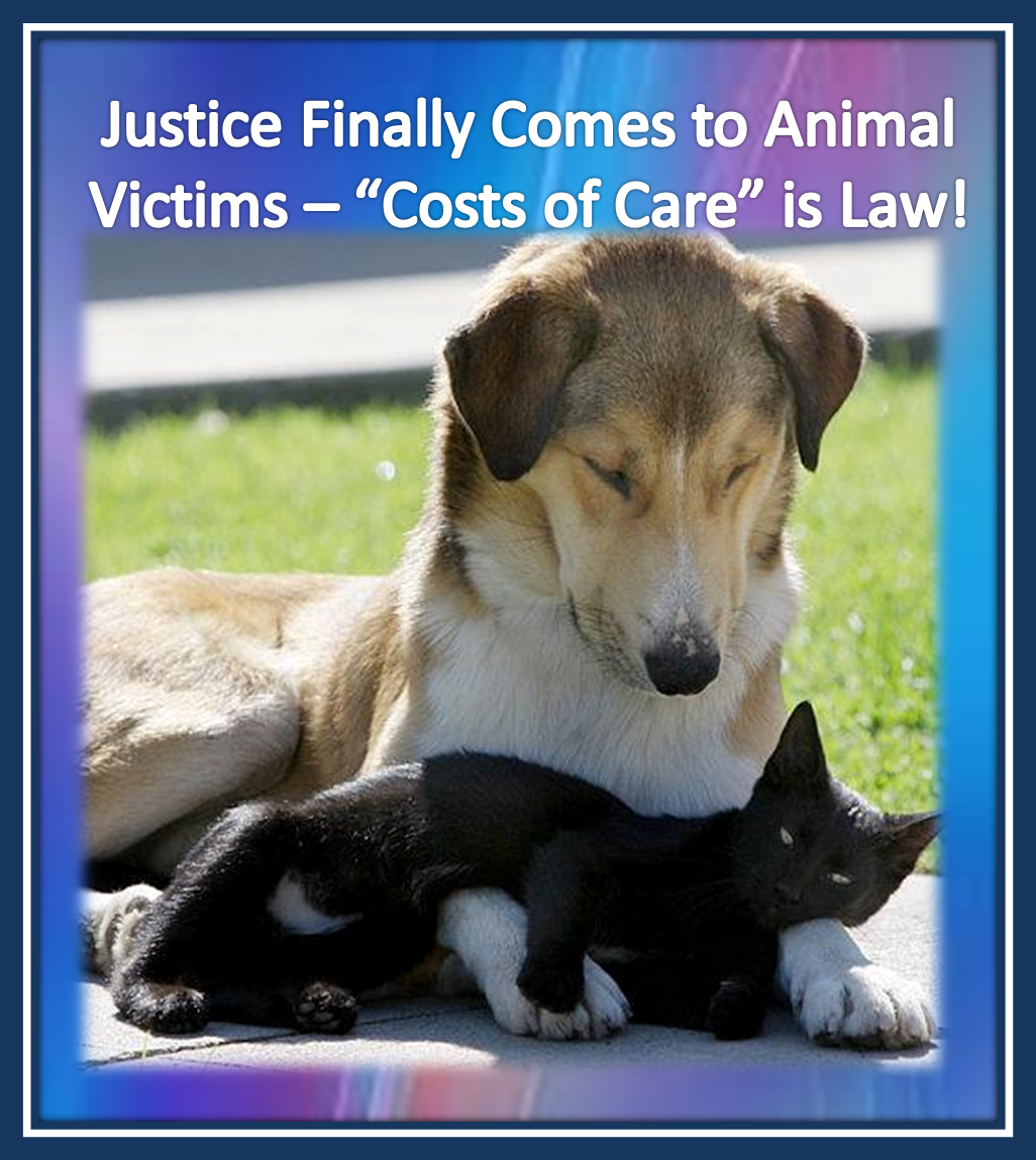 The passage of Costs of Care brought a sigh of relief to shelters and, more importantly the chance for a quicker path to freedom for these animals who have already been victimized and/or neglected.  With its passage, owners of animals that are the subject of animal cruelty cases can either pay for the costs of caring for them (as they would if their animals had never been seized) or relinquish them, allowing shelters to make them available for adoption. The law is already operating to help humane society police officers gain voluntary surrenders of animals for owners who, when told about the law, are unwilling to pay the costs of medical care, housing and feeding of their animals.   In those cases where owners wish to retain ownership (in the event they are acquitted or the court does not order surrender), the shelters must be paid the costs of care as they are incurred.  This allows them to use their limited resources to care for homeless animals.
